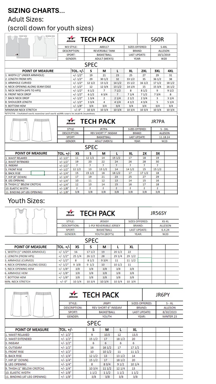 We are using the Black and White Alleson Crossover Reversible Jersey in both youth and adult sizes. Please use this size chart for more sizing information.